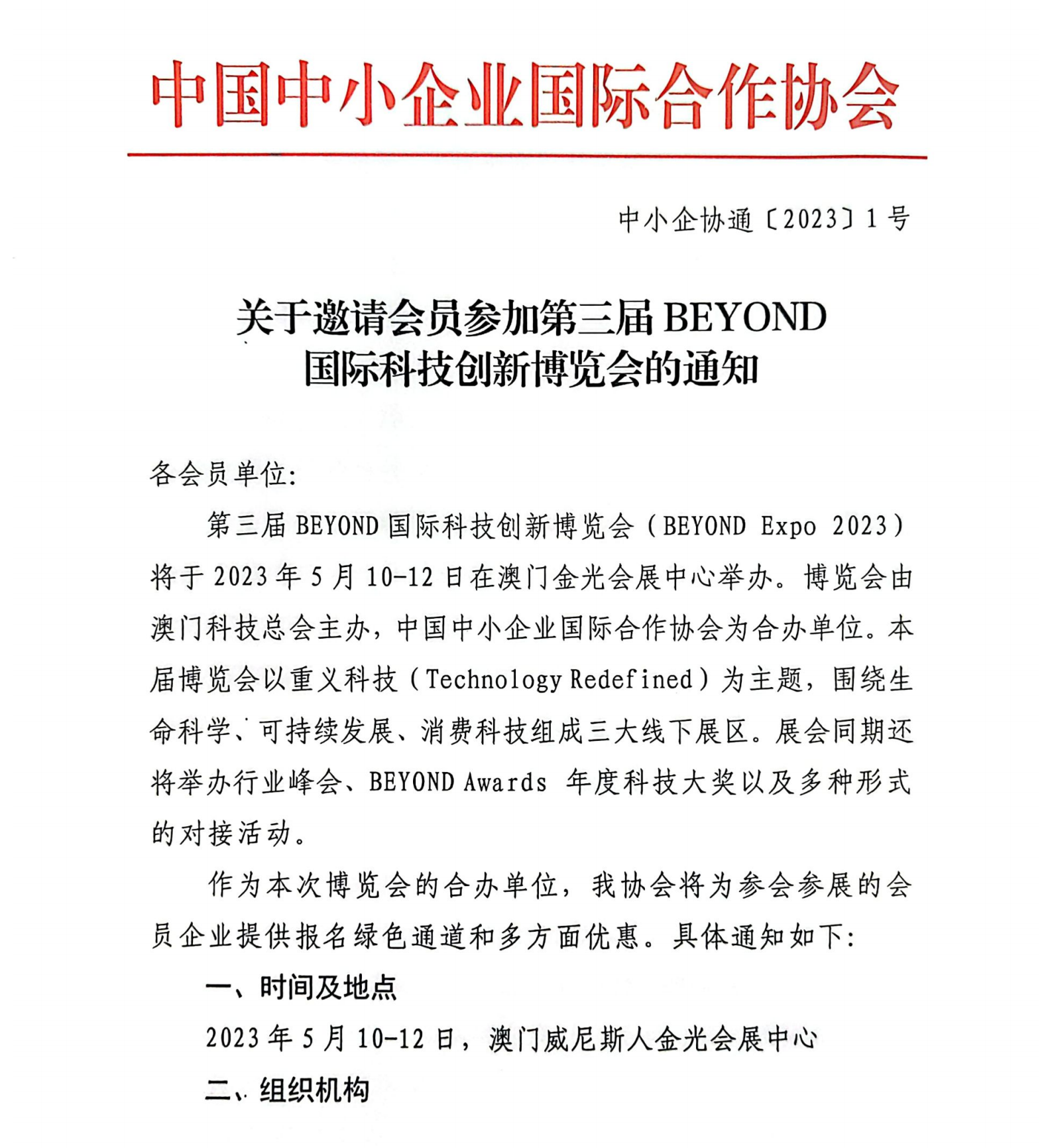 關(guān)于邀請(qǐng)會(huì)員參加第三屆BEYOND國際科技創(chuàng)新博覽會(huì)的通知