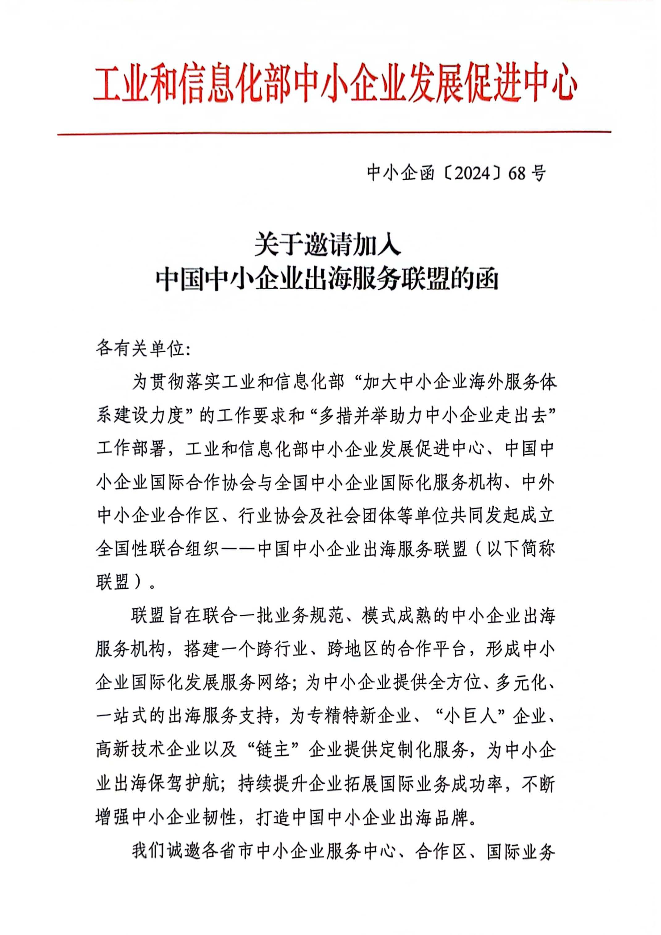 關(guān)于邀請加入中國中小企業(yè)出海服務(wù)聯(lián)盟的函